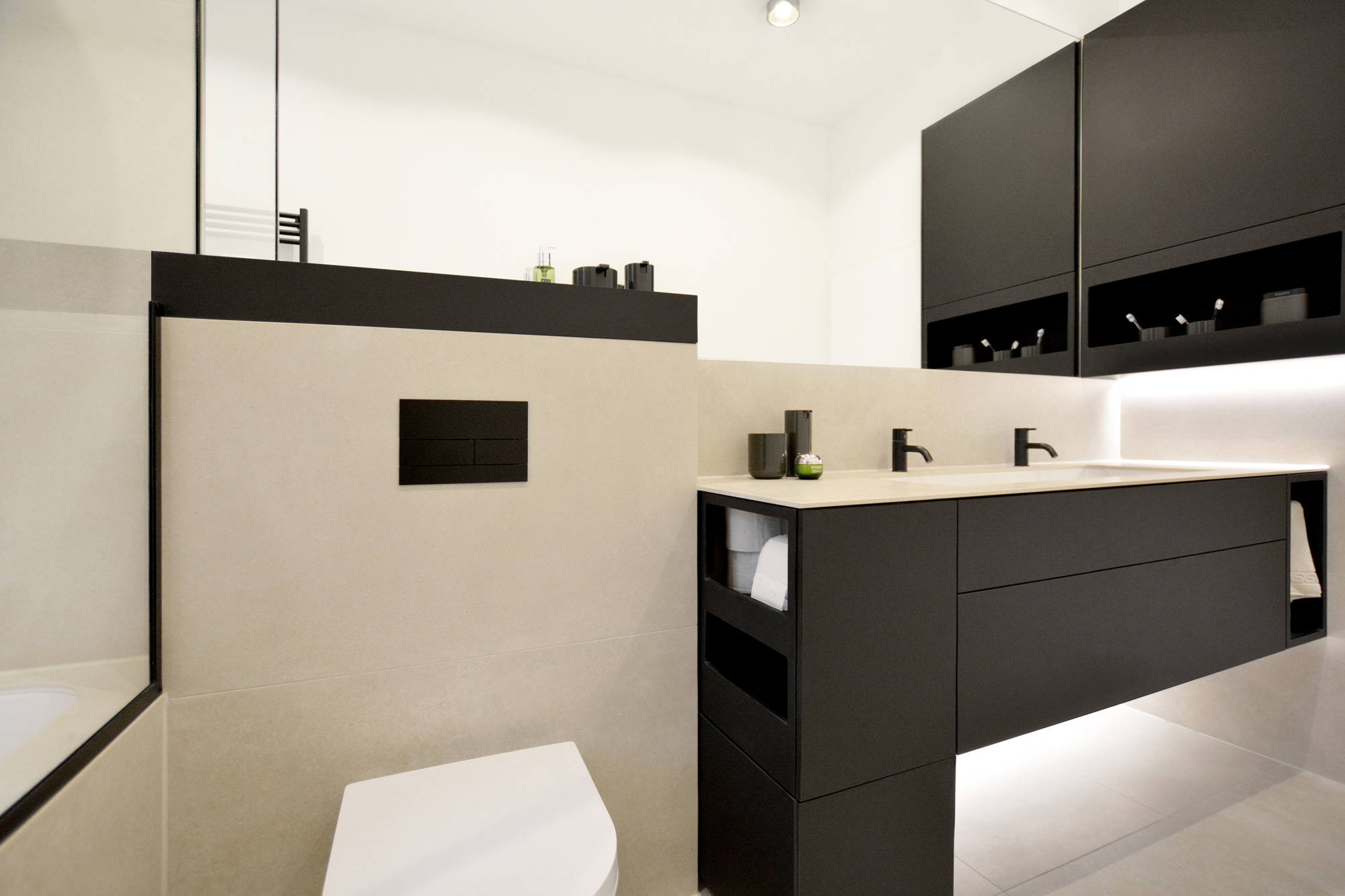 Diesen Bad-Ausbau haben wir mit Fenix-Verbundplatte ausgeführt.