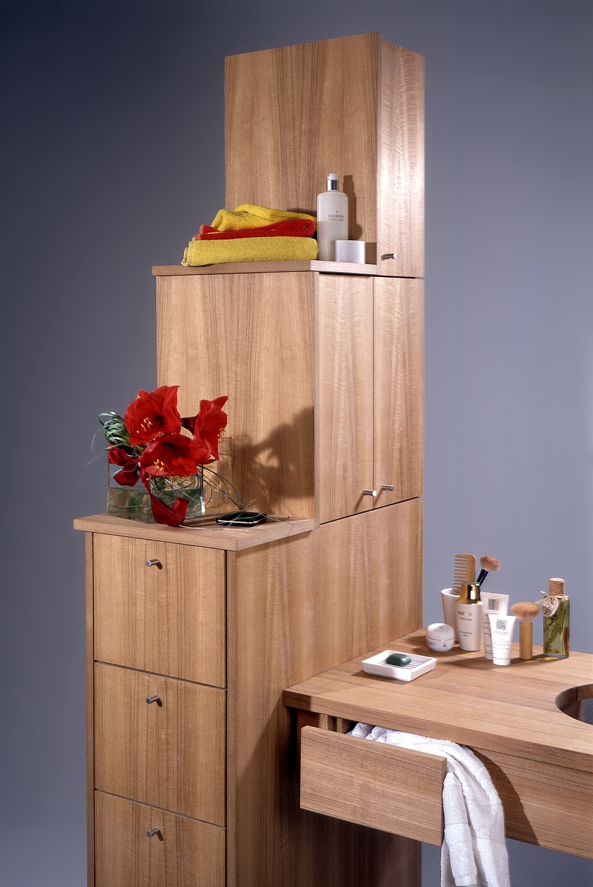 Wasch Dich, aber mach mich nicht nass? Keine Sorge, der Badezimmerschrank und der Waschtisch sind aus Teak und gar nicht wasserscheu!
