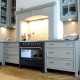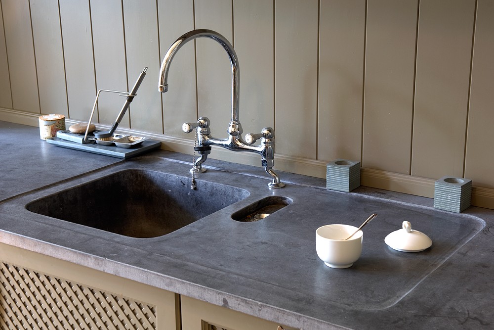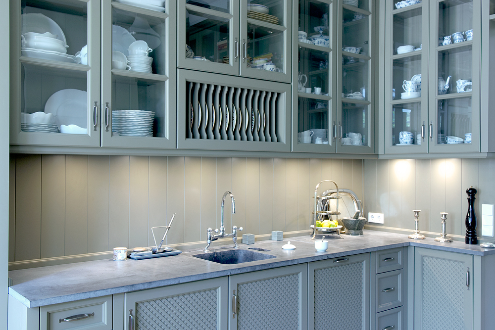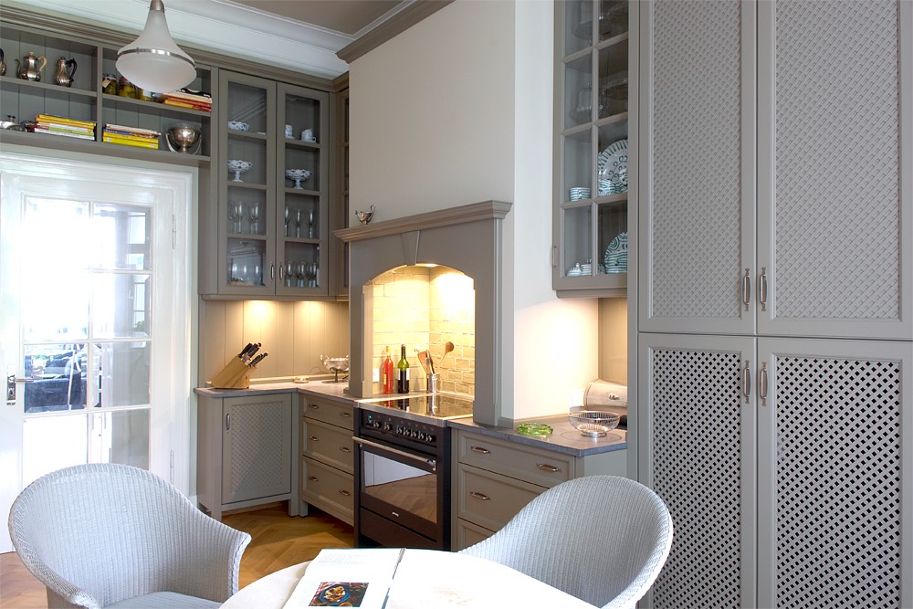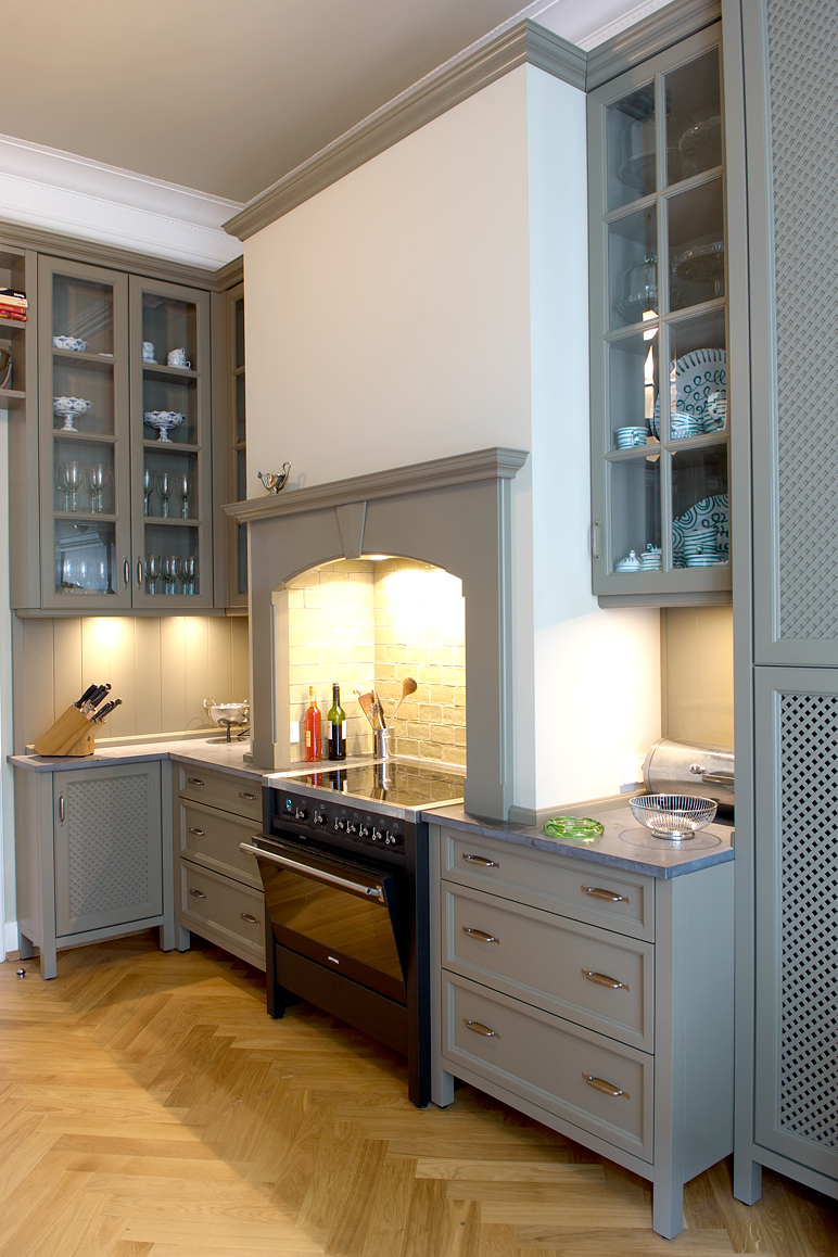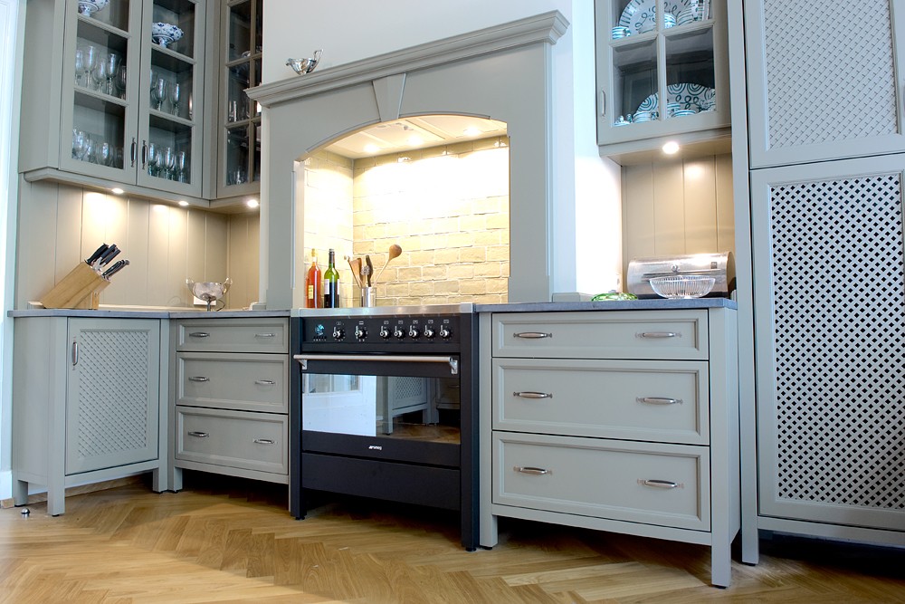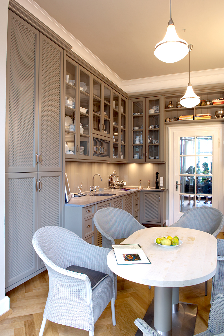Linde massiv, deckend lackiert. Arbeitsplatte aus Belgisch Granit