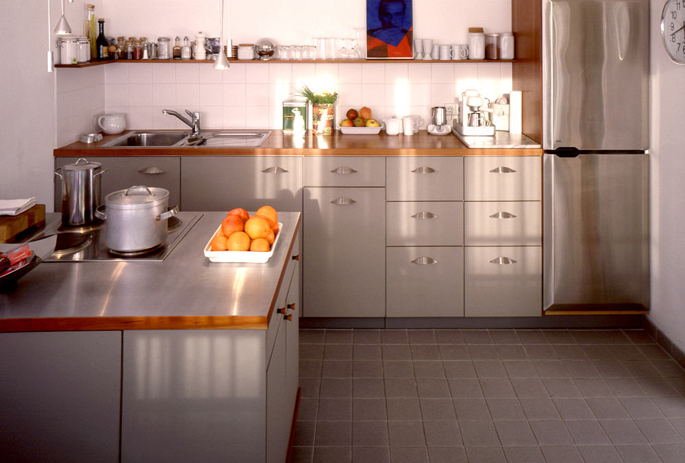 Diese Küche gehört Meister Proper, deswegen glänzen die Linoleumfronten der Schränke auch so. Die Arbeitsplatte ist aus Kirsche und Edelstahl.
