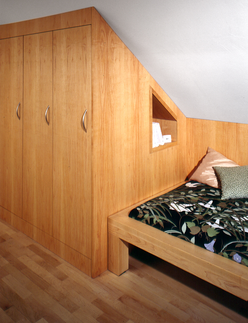 Das Thema Schlafzimmerausbau schneiden wir gerne an. Am liebsten schräg. Hier aus massivem und furniertem Ahorn.