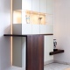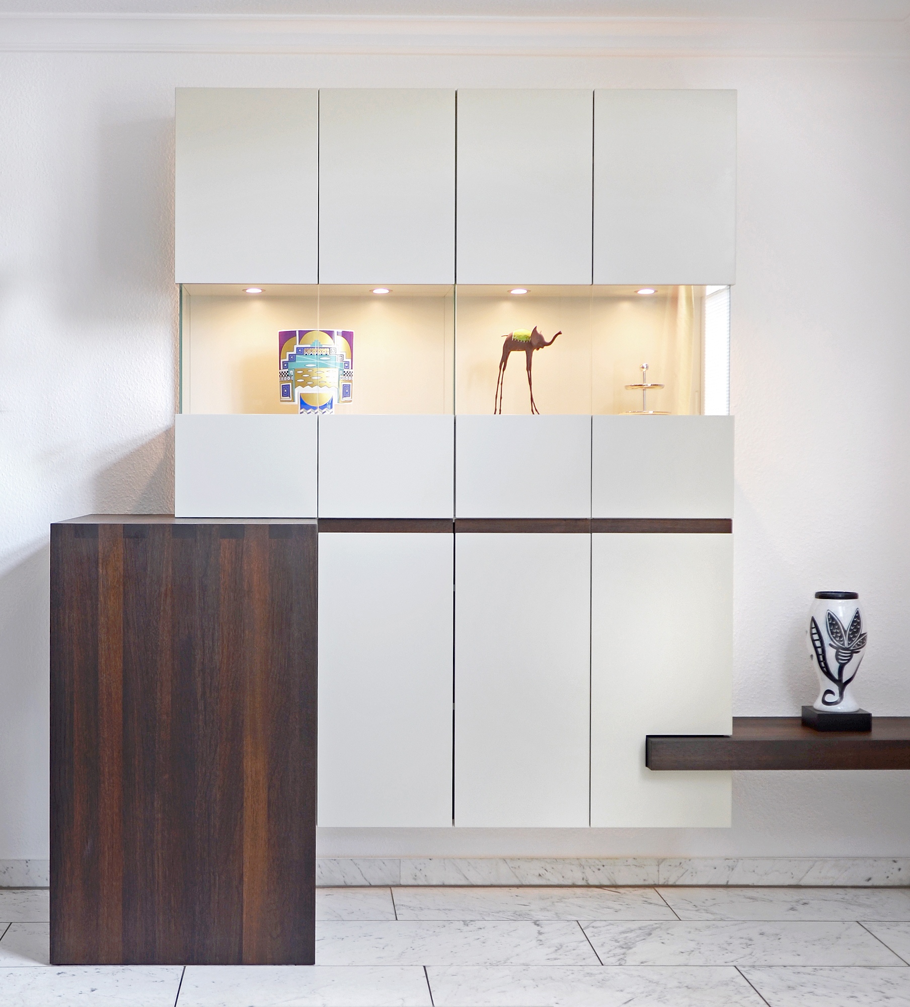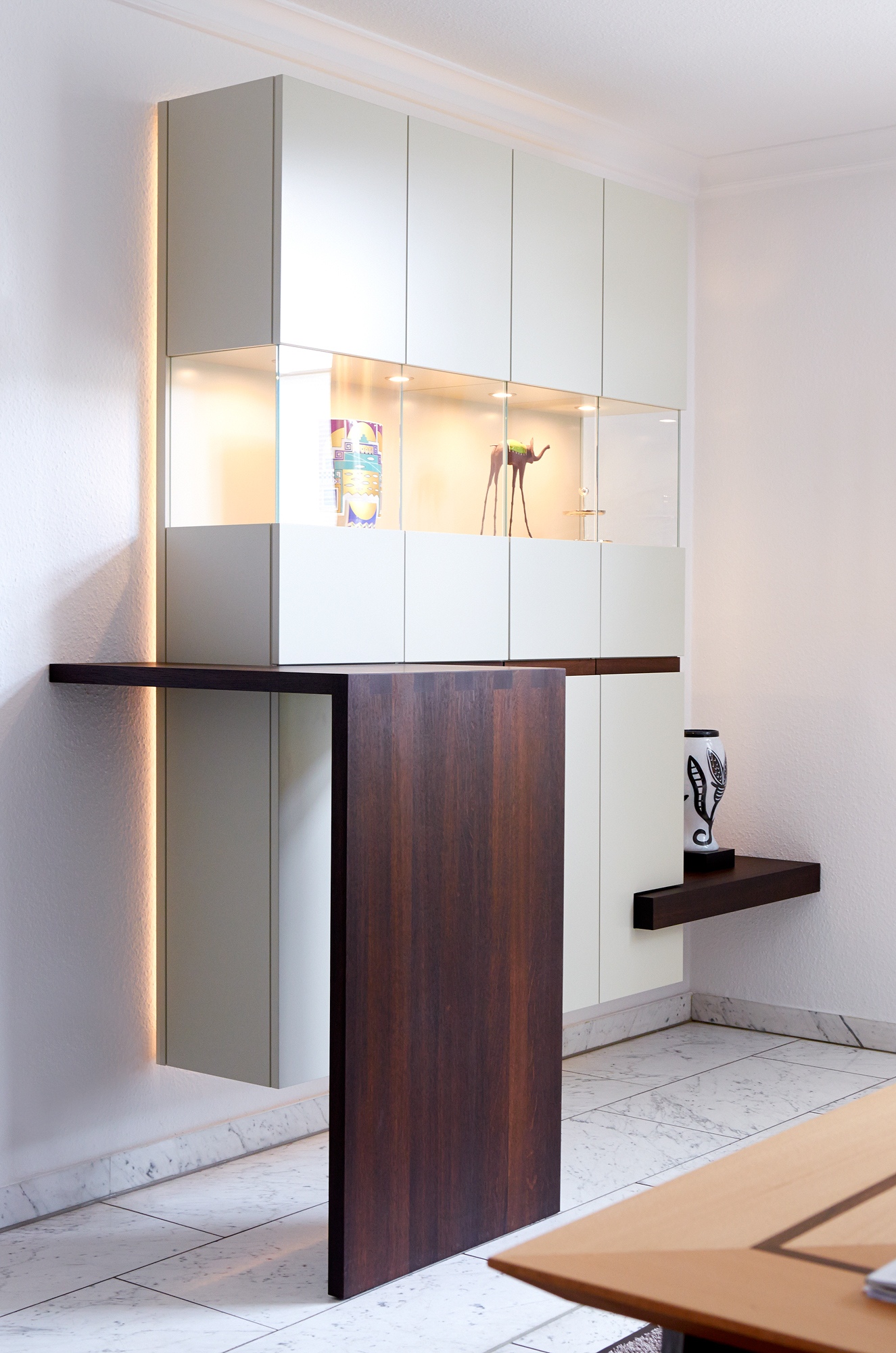 Schrank MDF deckend lackiert, Stehtisch aus massiver geräucherter Eiche geölt